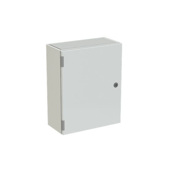 Cassa con porta cieca e piastra di fondo serie SR2, struttura in lamiera d'acciaio spessore 12/10, piastra di fondo in lamiera zincata spessore 20/10. Utilizzata per la realizzazione di quadri di comando e controllo delle più varie macchine industriali: da grossi macchinari a linee automatizzate di produzione o parti di esse, alle tipiche installazioni di quadri bordo macchina, a caldaie, impianti di riscaldamento ed altro ancora. Consente anche la realizzazione di quadri di distribuzione secondaria grazie alla possibilità di installare tutta la gamma di apparecchi e interruttori modulari su guide DIN abbinate ad appositi pannelli frontali modulari preforati e incernierati.