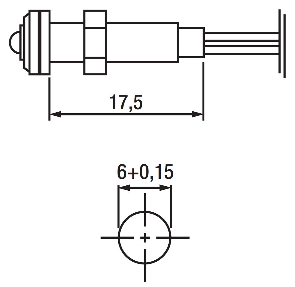 Indicatore luminoso LED Ø 6mm • Corpo cilindrico filettato - nero - policarbonato • Rondella di fissaggio • Ghiera cromata Ø 8 mm • Cavetti PVC 0,50 mm² - lunghezza 200 mm • Led Ø 3 mm