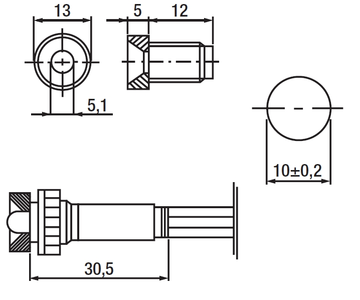 Indicatore luminoso LED • Corpo cilindrico filettato - policarbonato • Ghiera cromata alta Ø 13 mm • Cavetti PVC 0,50 mm² - lunghezza 200 mm • Led Ø 5 mm