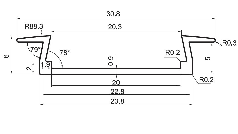 Profilo in alluminio anodizzato, per il montaggio ad incasso. Con diffusore in policarbonato satinato. Consente di alloggiare sino a 2 strisce led parallele tipo SMD 3528. Altezza ridotta: < 7 mm. Lunghezza: 2 m. Dimensioni: 30,8 x 6 mm.