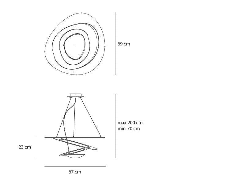 Lampada a sospensione in alluminio verniciato, ampliamento di gamma della serie Pirce. Da un disco sottile si aprono volute fluttuanti, che ricadono morbidamente verso il basso, creando magici effetti di forma e luce. Lampadina inclusa.