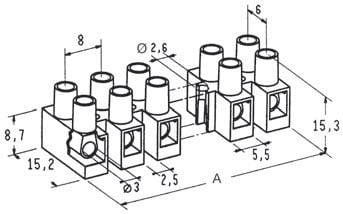 Morsettiere in nylon 12 poli - 2,5 mm2, con lamella di protezione •Materiale del corpo isolante: Poliammide (PA 6.6) naturale •Autoestinguenza: UL 94 - V2; IEC 695-2-1 a 850°C e IEC 695-2-2 •Temperatura ambiente di utilizzo: T 125°C •Temperatura di breve durata: T 160°C •Sezione nominale: 2,5 mm2 •Tensione nominale: 250/380 V •Tensione di prova: 2500 V •Corrente di prova: 24 A •Morsetto femmina: Ottone nichelato •Viti imperdibili: M 3x5 in acciaio zincato