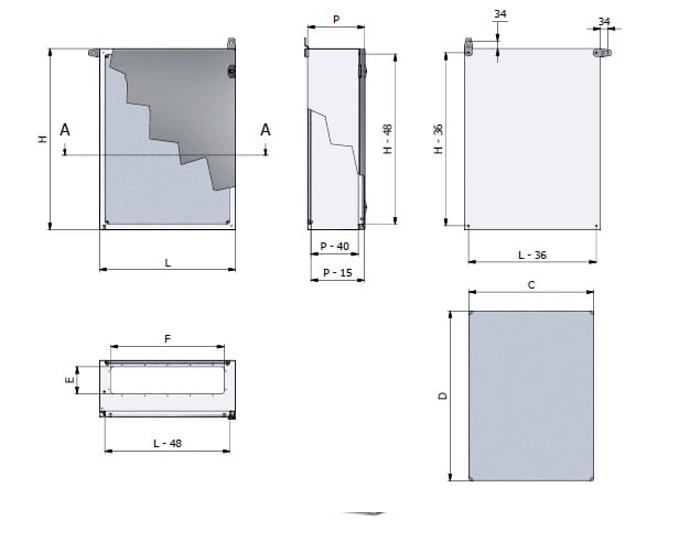 Cassetta composta da corpo, porta cieca esterna acciaio inos AISI 304, piastra interna fissata sul fondo e piastra passacavi• corpo in lamiera pressopiegata e saldata sp. 12-15/10, verniciatura con polveri epossipoliestere termoindurenti in tinta RAL7035bucciato • porta in acciaio inox 304 satinato scotch brite sp. 12-15/10 • piastra interna in lamiera sp. 15-20/10 sendzimir • guarnizioni, poliuretaniche applicate in colata continua • cerniere reversibili con apertura 110° • serratura con impronta doppia aletta • grado di protezione IP 66-UL NEMA TYPE 4 IK 10.