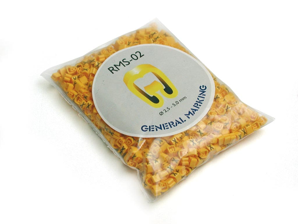 Anelli di siglatura RMS. Si presentano con taglio chevron per un perfetto allineamento sul cavo. La stampa dei contrassegni é realizzata a caldo, con leggera impressione nel materiale per mantenerne l’indelebilità nel tempo. Materiale: PVC morbido, autoestinguente cl. V0 (UL 94)