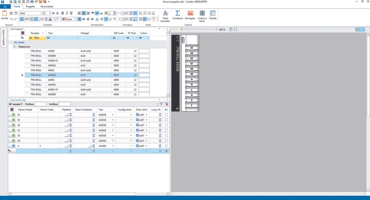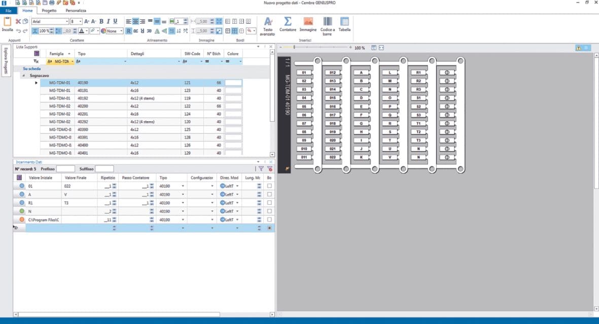 GENIUSPRO e il nuovo software sviluppato da CEMBRE. Esso racchiude in se l?esperienza decennale del precedente programma di siglatura e l?innovazione, apportata con i piu potenti linguaggi software per la stampa a colori di testi, simboli e immagini. Il suo utilizzo e semplice e intuitivo. L?inserimento dei dati di stampa richiede solamente le conoscenze informatiche di base, accessibili a qualsiasi tipo di operatore. L?anteprima dinamica in dimensioni reali del supporto che si sta utilizzando da una visione immediata e precisa del lavoro in esecuzione. Caratteristiche del Software ? Stampa targhette segnacavo, morsetti, contattori, connettori, pulsanti, componenti, targhe quadro ed etichette adesive ? Inserimento dei dati veloce e intuitivo ? Editor grafico per targhe quadro e modelli ? Sviluppo di progressioni alfanumeriche (es: da A01 a Z99) ? Conversione dei file di Matrix, ACS e Simplo ? Importazione guidata da Excel?, CSV, TXT e dai principali CAD Elettrici come EPLAN, IGE-XAO, SPAC, ZUKEN E3 e molti altri ? Importazione immagini vettoriali, BMP, JPEG, PNG e GIF ? Utilizzo dei font di Windows? installati ? Supporto per testi in lingue asiatica, russa e araba ? Aggiornamenti gratuiti per sempre ? Guida in linea