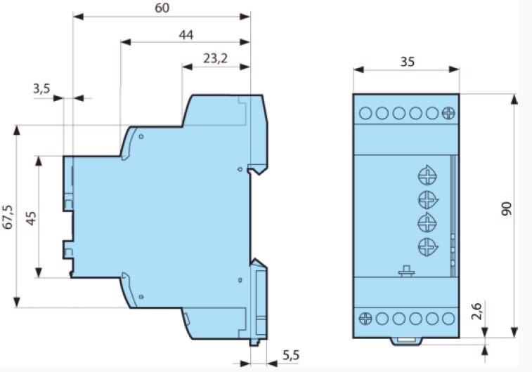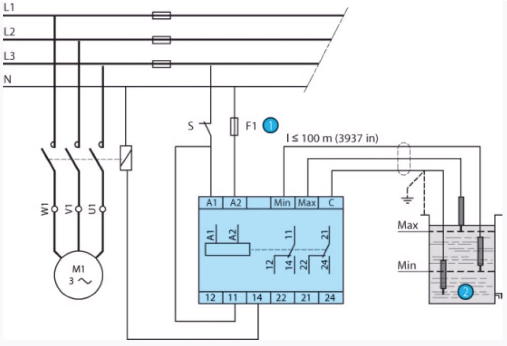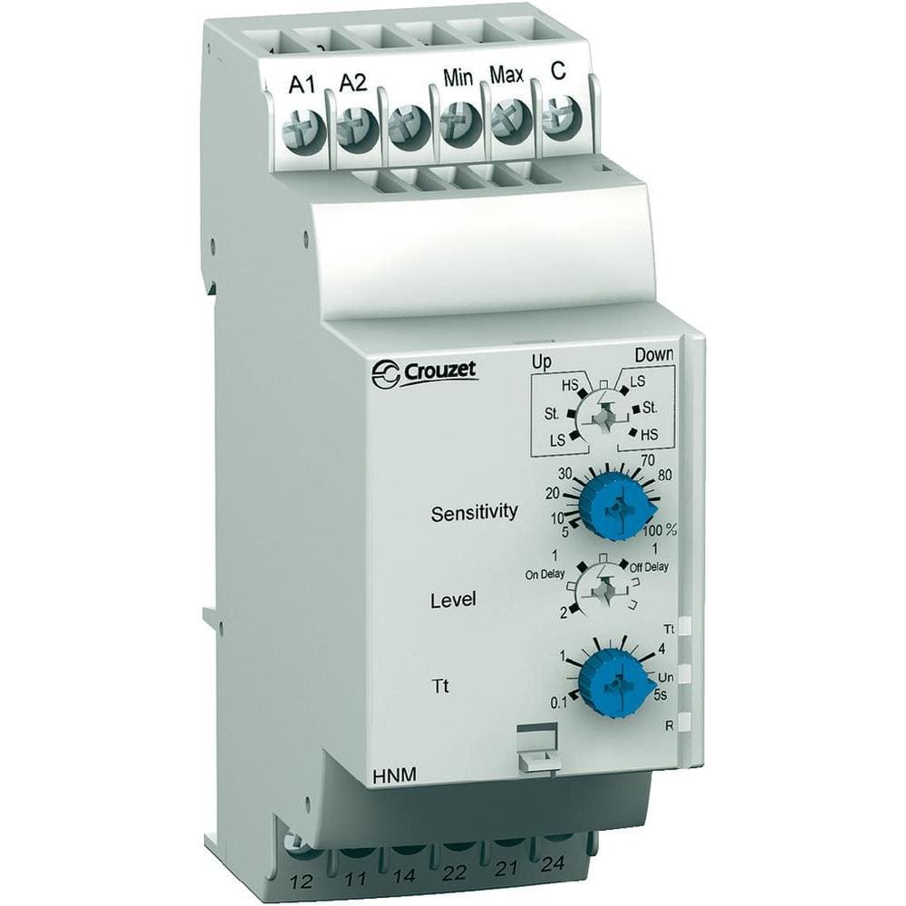Relè di controllo livello, idoneo al montaggio su guida DIN, idoneo per il monitoraggio del livello di liquidi conduttivi mediante sonde resistive. Il principio si basa sulla misura della resistenza apparente del liquido tra due sonde immerse. Quando questo valore è inferiore al valore di soglia prestabilito visualizzato sul fronte anteriore dell'unità, lo stato relè passa. Per evitare fenomeni di elettrolisi, una corrente alternata attraversa le sonde. Un interruttore rotativo sulla faccia anterioro puòessere utilizzato per selezionare la gamma di funzioni e la sensibilità desiderata.