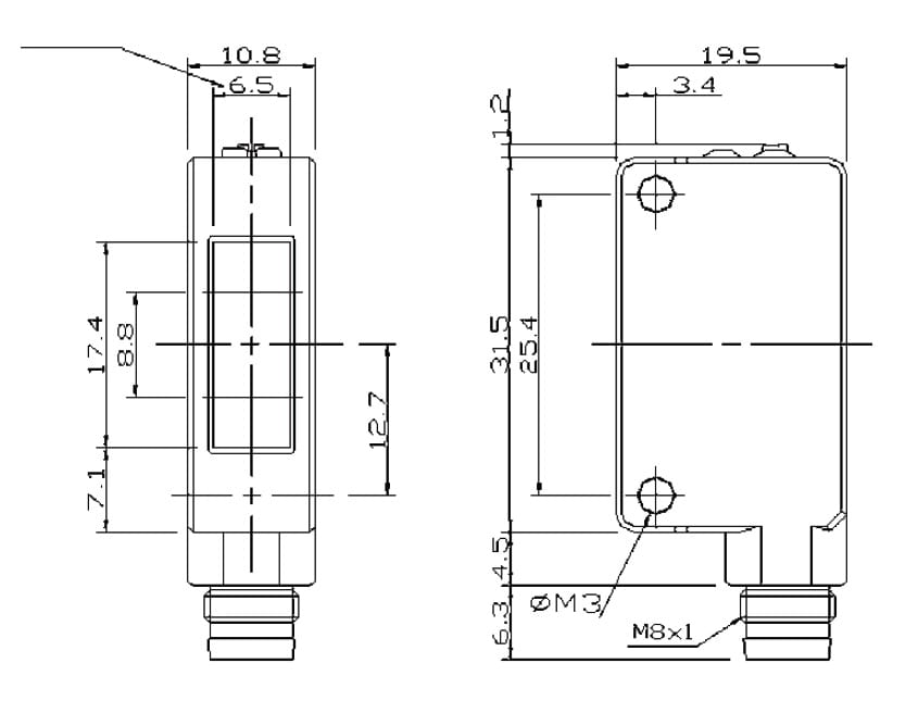 Sensore fotoelettrico in miniatura in standard asiatico. Tasteggio 0,7 m, 150 mm con fascio stretto. Uscita in configurazione standard a 3 fili.