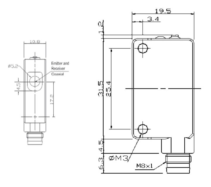 Sensore fotoelettrico in miniatura in standard asiatico. Tasteggio 0,7 m, 150 mm con fascio stretto. Uscita in configurazione standard a 3 fili.