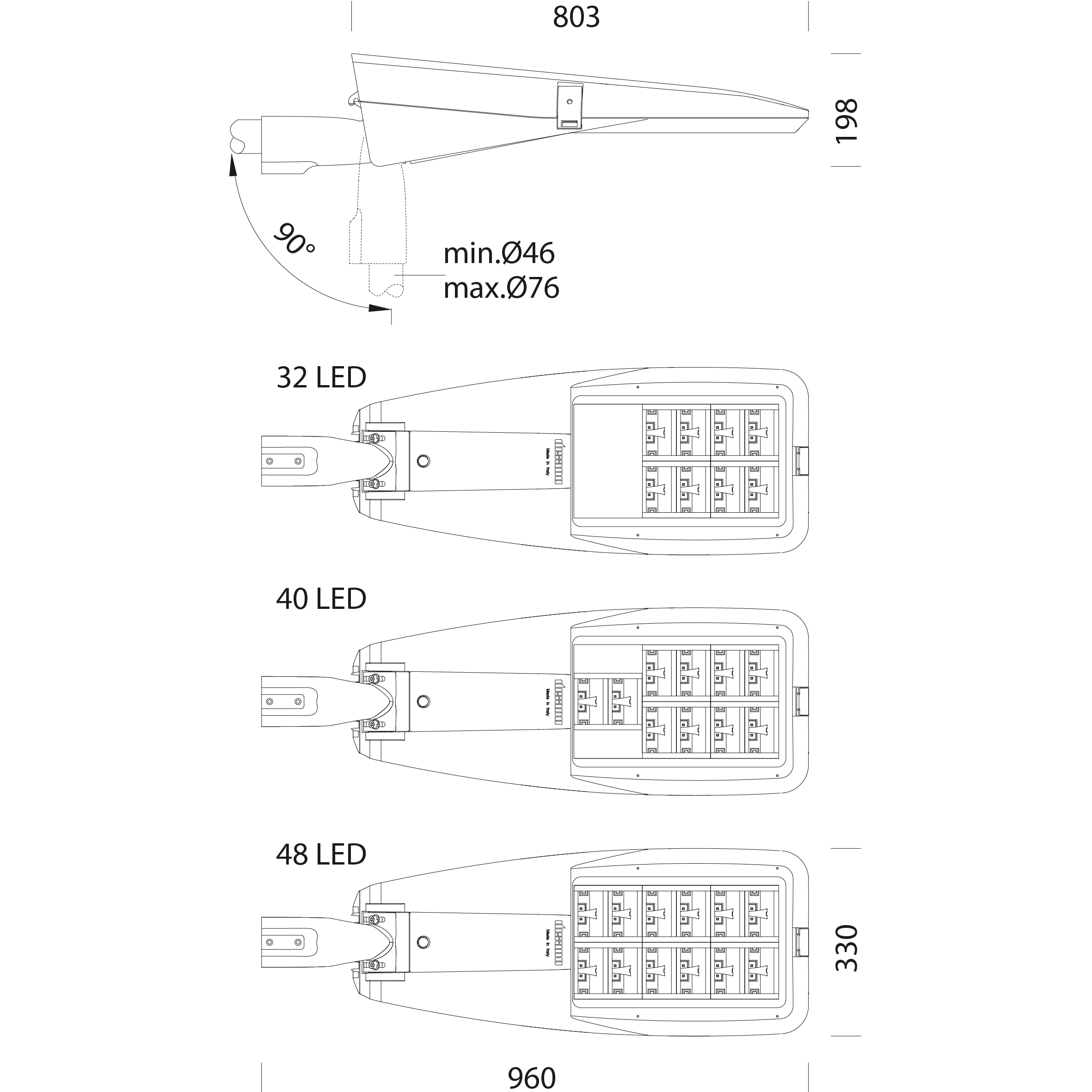 3390 Sella 2 - ST. Corpo e coperchio: stampati in alluminio pressofuso e disegnati con una sezione aerodinamica a bassa superficie di esposizione al vento. Alette di raffreddamento integrate nella copertura. Ottiche: in alluminio rivestito con argento ad altissima purezza 99.99%, con procedimento sotto vuoto (PVD). Attacco palo: In alluminio pressofuso idoneo per pali di diametro da min. 46mm a max. 76mm orientabile da 0° a 20° per applicazione a frusta; e da 0° a 20° per applicazione a testa palo. Passo di inclinazione 5°. Diffusore: vetro extra-chiaro sp. 4mm temprato resistente agli shock termici e agli urti (UNI-EN12150-1: 2001). LED white 235 - 4000K - 34320lm - CRI 70 - surge protector 6/8kV - Tj=85°C. Colore: Grafite.