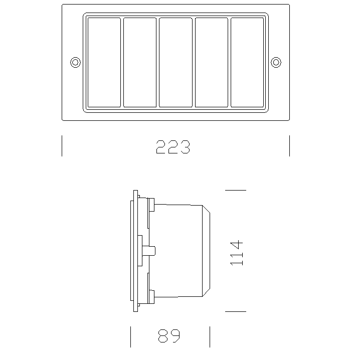 CORPO: In nylon, infrangibile stabilizzato ai raggi UV. CORNICE: In alluminio pressofuso. DIFFUSORE: In plexiglas opale. VERNICIATURA: Ad immersione per cataforesi epossidica, colore nero (cornice/griglia), resistente alla corrosione e alle nebbie saline e finitura bugnata con vernice acrilica. NORMATIVA: Prodotti in conformità alle vigenti norme EN60598-1 CEI 34-21 e sono protetti con il grado IP54IK08 secondo le EN 60529. In classe di isolamento II. LED: 4000K - 280lm - 110mA - 2.2W.