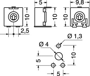 TRIMMER A STRATO DI CARBONE ACP 10x10 MONTAGGIO ORIZZONTALE REGOLAZIONE VERTICALE ROTORE CON TAGLIO PER CACCIAVITE. MAX POT. A 40°C:0,15 W. MAX TENS.:200 VCC. ANG. ROTAZIONE: 240° ± 5 °. TOLLERANZA:±20%. TEMP. LAV.:25°C ÷+70°C. CURVA:lineare. PASSO:5x10mm. CA9PV10-100KA2020.