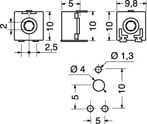 TRIMMER A STRATO DI CARBONE ACP 10x10 MONTAGGGIO ORIZZONTALE REGOLAZIONE VERTICALE ROTORE CON FORO PER PERNO. MAX POT. A 40°C:0,15 W. MAX TENS.:200 VCC. ANG. ROTAZ.:240°±5°. TOLLERANZA:±20%. TEMP. LAV.:-25°C÷+70°C. CURVA:lineare. PASSO:5x10 mm. PERNI:15/106 ÷ 15/110. MANOPOLE:15/152. CA9MV10-1MA2020-SH.