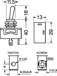 Interruttore unipolare a levetta, corpo in resina fenolica, leva in ottone nichelato, contatti in argento, terminali faston 6,35