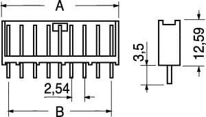 CONNETTORI MASCHIO SU FILA SINGOLA DIRITTI AMP SERIE MODU II CONTATTI STAGNATI. Con pareti di polarizzazione e ritegno meccanico del connettore femmina per una migliore connessione. MONTAGGIO:c.s. PASSO:2,54 mm. CORR. NOM. X CONT.:3 A. TENS. PROVA:750 V.TEMP. LAV.:-65°÷+105°C. CORPO:poliest. caric. vetro grado di autoest. 94 VO. CONTATTI:stagnati su bronzo 2 µm min. PER CONNETTORI:5/5700. Impiegati su kit e montaggi elettronici in genere. Dim. A: 17,52mm. Dim. B: 12,70mm.