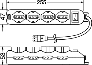 Presa multipla a 12 posti con interruttore. Dotata di interruttore luminoso. Con terra; base e coperchio in materiale termoplastico antiurto. Prese con alveoli di sicurezza schermati. Con possibilità di fissaggio. • Portata: 16A - 250V • Potenza max: 2500W