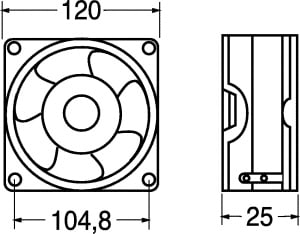 VENTILATORE ASSIALE SUPPORTO BRONZINE 120x120x25.4 mm. ELICA:poliestere termopl. TEMP. LAV.:-10°C÷+70°C. FATT. RUMORE:42 dB. GIRI MIN./RPM:3000. CFM:80. GRIGLIA:45/9655. Per applicazioni varie. Tensione: 12V.