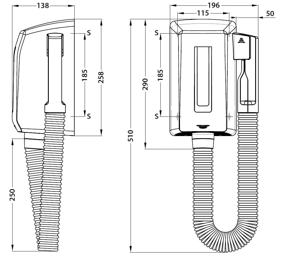 • Flusso d’aria ad alta velocità (79 Km/h) per una rapida asciugatura • Sistema di sicurezza per lo spegnimento automatico dopo 15 minuti di uso ininterrotto • Isolamento termico del tubo per un uso sicuro e confortevole • Coperchio in un unico pezzo, inABS spessore 3 mm di colore bianco • Ventola elicoidale in PP ignifuga UL94-V0 • Motore con protezione termica • Resistenza, a fi lo ondulato, in NiCr, dotata di termostato di sicurezza a riarmo automatico • Tubo estensibile in poliuretano, colore bianco. Fissato ad anelli girevoli che impediscono che il tubo si avvolga su se stesso • Impugnatura in termoplastica ABS con rinforzo interno anticalore • Ganci e attacchi in termoplastica ABS