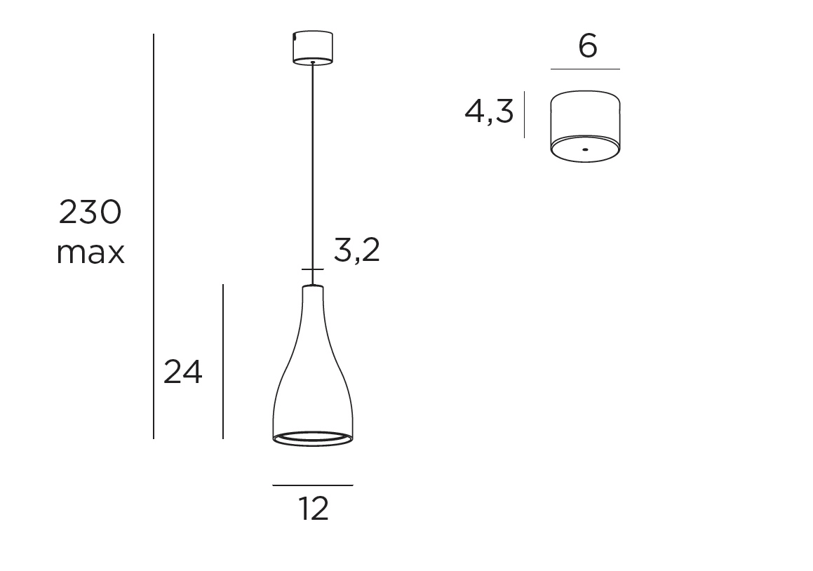 Apparecchio a sospensione con sorgente luminosa a LED. Corpo e rosone in alluminio tirato verniciato esternamente bianco lucido, che si ottiene tramite un processo naturale di ossidazione successivamente protetto tramite una verniciatura trasparente opaco. Sorgente Luminosa: LED 9W 1100Lm 3000K.