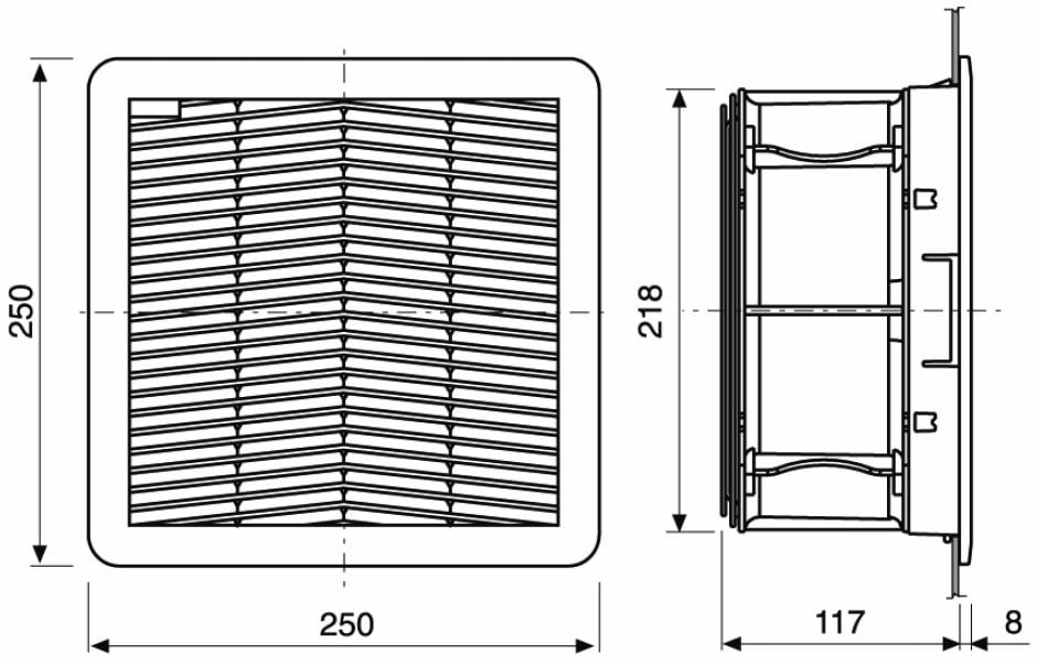 Gruppo filtro "FPF" con flusso d'aria dall'esterno verso l'interno dell'involucro. Grazie al particolare design risponde alle esigenze di compattezza e rapidità di installazione tipiche delle moderne apparecchiature. Caratterizzato da un basso profilo esterno, da un sistema di montaggio a scatto con ganci elastici e da una guarnizione di tenuta premontata che consente di ottenere una protezione alla polvere e all'acqua. Montaggio senza viti in aperture di forma quadrata come da schema di foratura; spessore della lamiera compreso tra 1,5 e 2,2 mm; eventuale fissaggio attraverso viti a testa svasata non fornite. Parti plastiche in PC/ABS, guarnizione di tenuta in schiuma poliuretanica posizionata a macchina. Panno filtro in fibre sintetiche termolegate a struttura progressiva, classe di filtrazione G4 secondo EN 779. Ventilatori su cuscinetti a sfera schermati e autolubrificati.