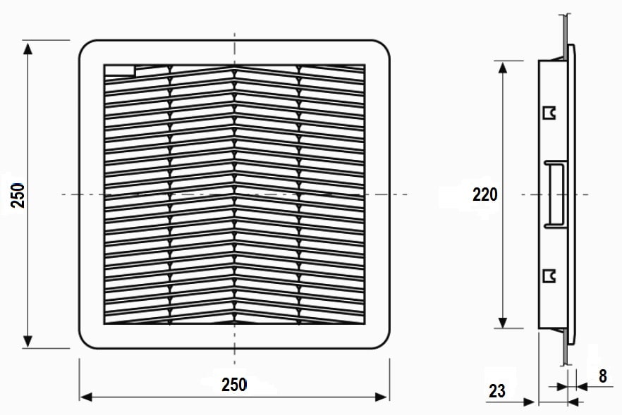 Gruppo filtro "FPF" con flusso d'aria dall'esterno verso l'interno dell'involucro. Grazie al particolare design risponde alle esigenze di compattezza e rapidità di installazione tipiche delle moderne apparecchiature. Caratterizzato da un basso profilo esterno, da un sistema di montaggio a scatto con ganci elastici e da una guarnizione di tenuta premontata che consente di ottenere una protezione alla polvere e all'acqua. Montaggio senza viti in aperture di forma quadrata come da schema di foratura; spessore della lamiera compreso tra 1,5 e 2,2 mm; eventuale fissaggio attraverso viti a testa svasata non fornite. Parti plastiche in PC/ABS, guarnizione di tenuta in schiuma poliuretanica posizionata a macchina. Panno filtro in fibre sintetiche termolegate a struttura progressiva, classe di filtrazione G4 secondo EN 779.