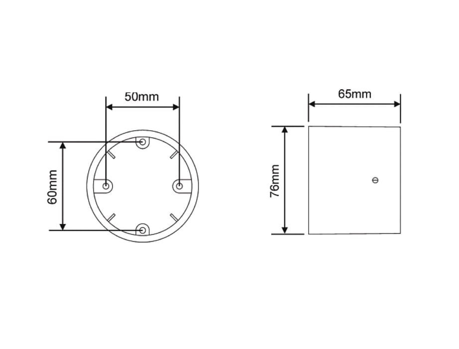 Scatola posteriore per montaggio su superficie per sensori Oridim e sensori PIR compatti. Fornisce il montaggio su superfici. 65x76mm.