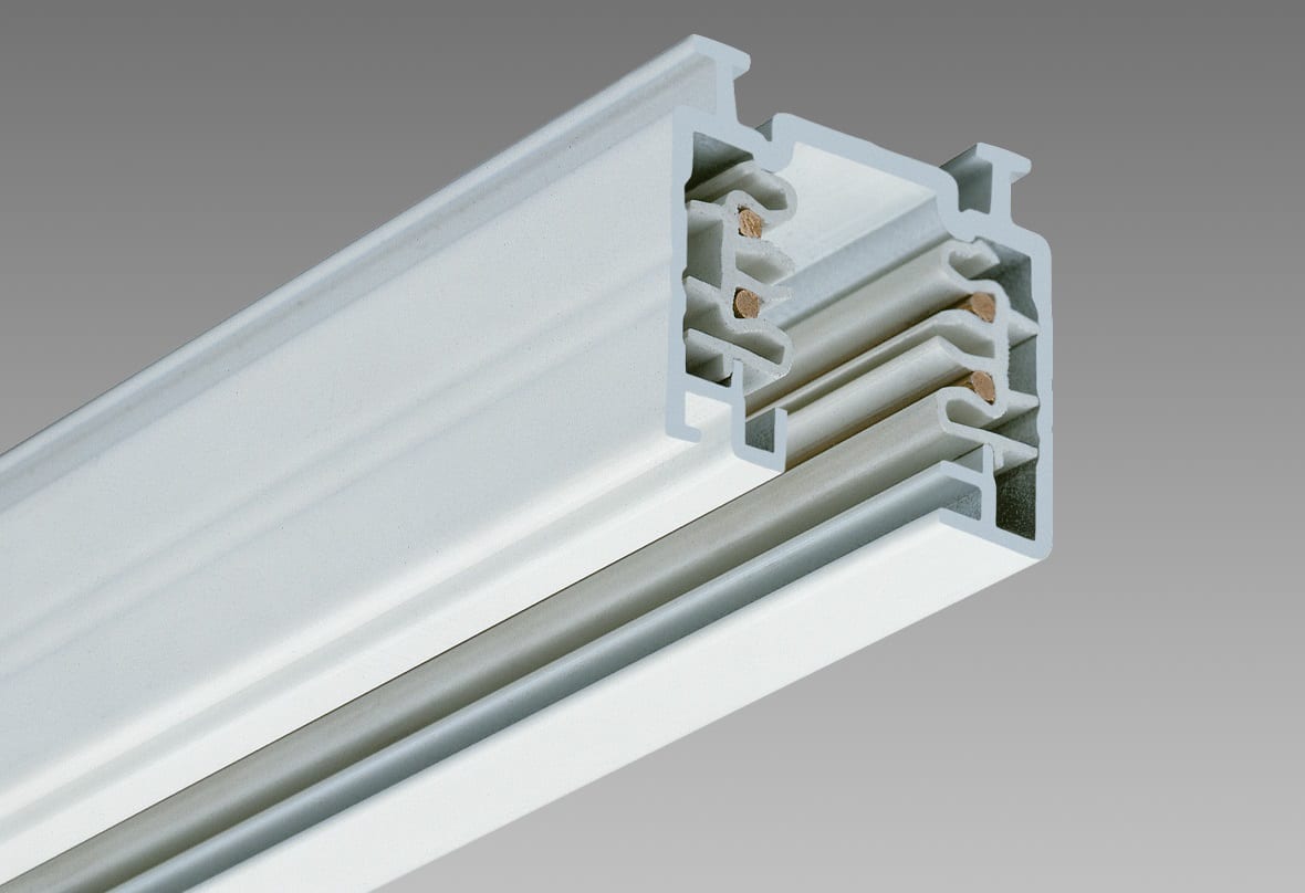 Binario trifase per 3 circuiti elettrici separati. Di sezione rettangolare in alluminio estruso, contiene un profilo sagomato in PVC isolante dotato di 4 conduttori in rame, mentre il profilo stesso realizza la messa a terra del sistema. Portata max 16Aper ogni conduttore. Realizzato secondo le normative CEI34-17/EN60570/IEC570 ha ottenuto la certificazione di conformità europea ENEC. D A richiesta Omnitrack può essere facilmente tagliato nella misura desiderata. Completo di una testatina di chiusura. Nella parte superiore del binario sono previste asole per il fissaggio o cave per l’attacco di accessori.