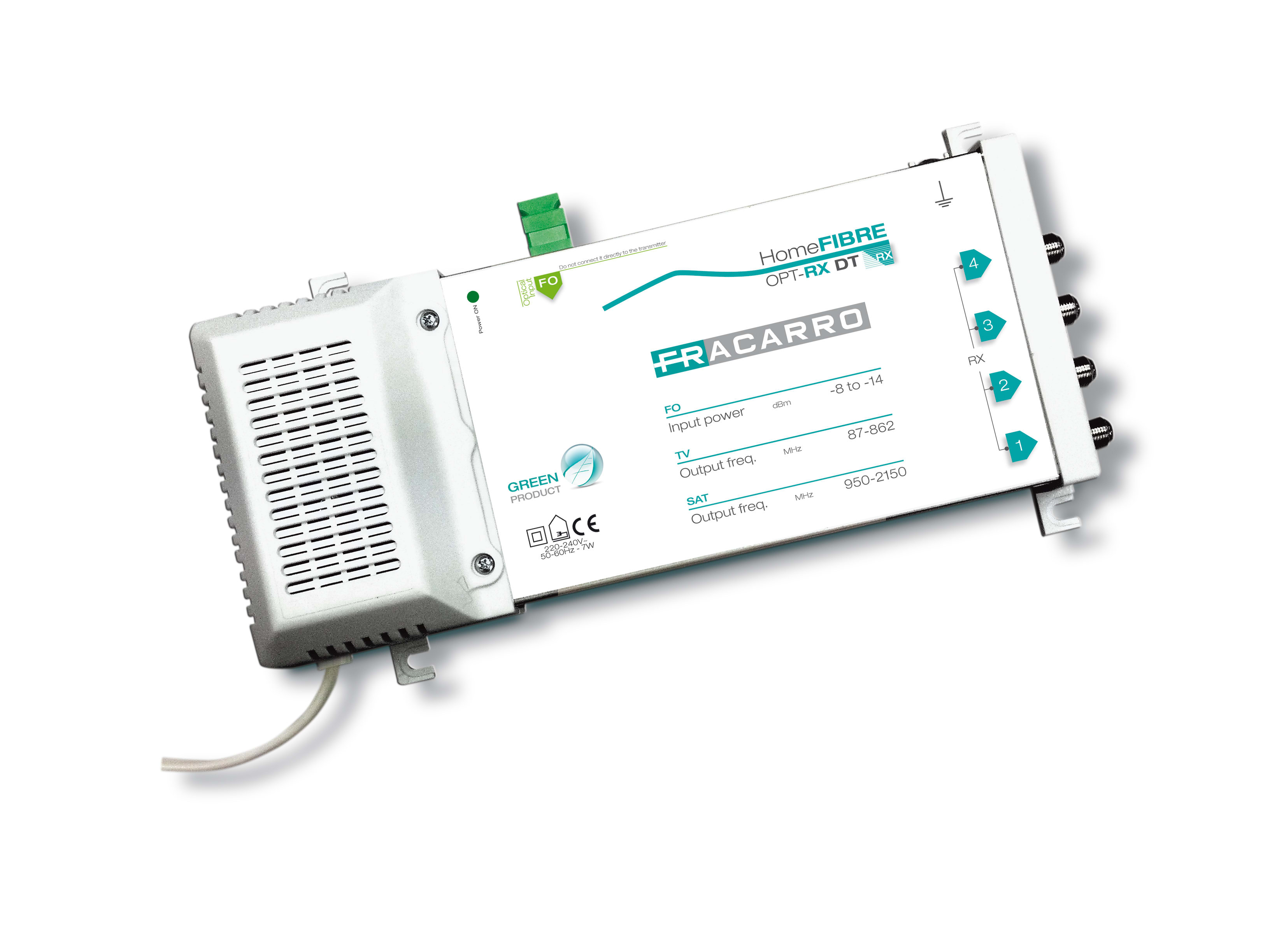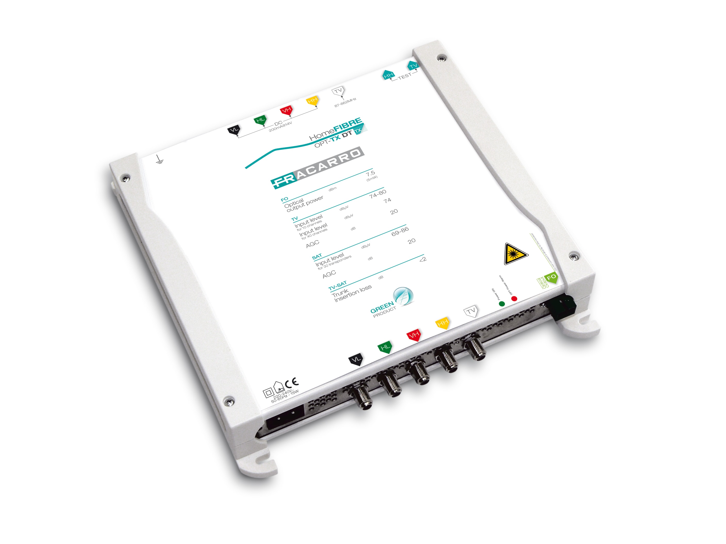 L’innovativo sistema di distribuzione in Fibra ottica è stato progettato con particolare attenzione alla facilità d’installazione dalla centrale ai punti presa,per la distribuzione sia dei segnali SAT provenienti da una parabola sia di quelli DTT. Il sistema usa LNB e parabole di tipo convenzionali e non richiede particolari strumenti di allineamento ottico; consente la distribuzione SAT e TV su una unica fibra 9/125um arrivando fino alla presa utente in ottico.Trasmettitori addizionali possono essere collegati in cascata con una dorsale a 5 cavi coax standard,consentendo grande flessibilità di progettazione del sistema con un elevato numero di prese.