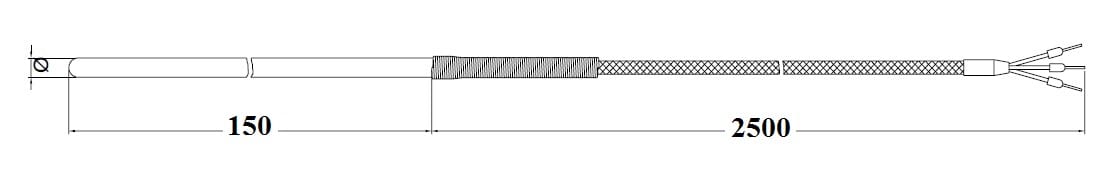 termoresist. materie plastiche: Mod.: TR1 (singolo elemento) modello: senza raccordo elemento + numero fili:Singolo 3 fili classe precisione:Pt100 classe B (1 DIN) Cavo (Standard a norma DIN):TTS (0,35 mm) Materiale guaina: Acciaio Inox Diametro guaina (mm): 8 lunghezza cavo (dm):25 dm tipo di connettore:nessun connettore armatura:nessuna guaina lunghezza immersione Li (mm): 150 mm certificati: nessuno