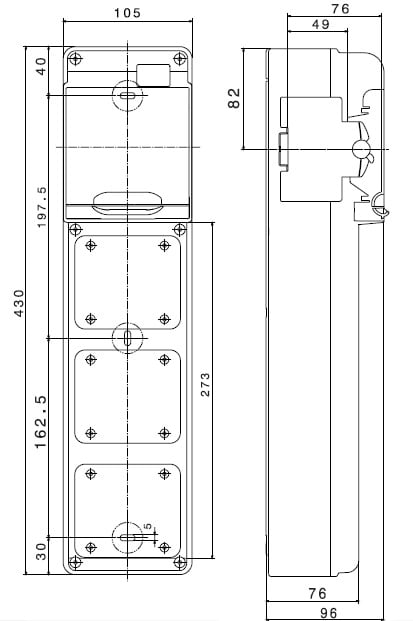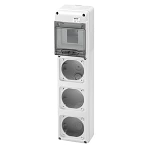 Quadro stagno Q-DIN 5 moduli vuoto in plastica grigio RAL 7035 IP65. • Numero di calotte: 3 IEC 309 16A IP44/67 • Numero di coperchi ciechi in dotazione: 1 IEC 16A