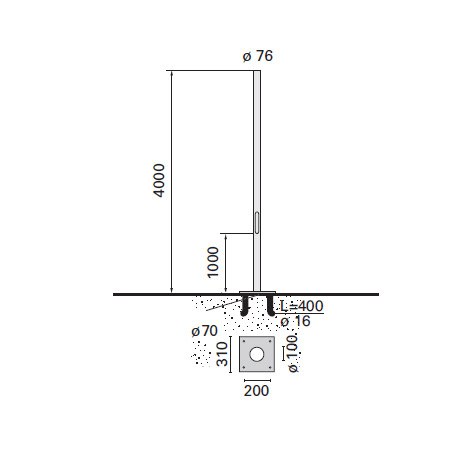 Palo cilindrico realizzato in acciaio zincato a caldo 70 micron, come da normativa UNI EN ISO 1461 (EN 40-5), con successivo trattamento superficiale di verniciatura acrilica a polvere texturizzata grigio. Il palo è costituito da un unico tubo saldato, diametro ø76mm, spessore 3 mm e altezza 4000 mm . L'asola per la portella è dimensiona a 132x38 mm, ad altezza 1000 mm dal terreno, idonea per il montaggio della morsettiera ad un fusibile (cod. 1864) . Portella realizzata a toppa, in lega di alluminio GDALSI 12 La piastra di ancoraggio per il supporto del palo è in acciaio EN 10025S235JR (ex Fe 360 UNI 7070) zincato a caldo 70 micron, come da normativa UNI EN ISO 1461 (EN 40-5); ha geometria quadrata, dimensioni 280x280 mm e spessore 15 mm. Le 4 asole di dimensione 47x22 mm, con interasse di 200x200 mm, permettono il passaggio dei tirafondi di fissaggio. Il palo è assicurato alla piastra tramite saldatura alla base.; I tirafondi in acciaio, lunghi 400 mm e con diametro 18 mm, sono bloccati tramiteviterie in acciaio. Dimensioni (mm): ø76x4000. Colore: Grigio.