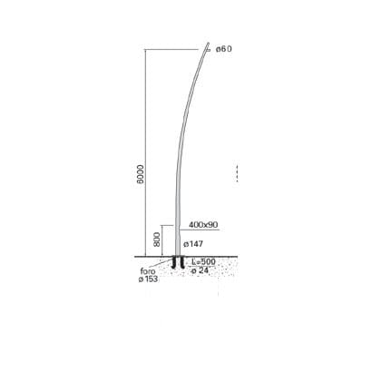 Palo conico curvo, H 6000mm. Palo di geometria conica curva, realizzato in acciaio zincato a caldo 70 micron come da normativa UNI EN ISO 1461 (EN 40-5), sottoposto a trattamento di verniciatura a polvere texturizzata RAL 9007. Il palo è costituito da ununico tubo metallico; è in acciaio EN10025-S235JR, ha un diametro alla base 147 mm e ø70 all’estremità superiore, spessore 3 mm e altezza 6000 mm f.t. L'asola per la portella è dimensiona a 400x90 mm, ad altezza 800 mm dal terreno, idonea per il montaggio della morsettiera a due fusibili (cod. 1863). Il palo permette l'istallazione di morsettiere italiane (grado di protezione IP44 IK08), francesi, spagnole (solo piccole), inglesi (con adattatore in legno marino cod. BZC2 da ordinare separatamente) e tedesche/svizzere (tramite guida DIN cod. B943 da ordinare separatamente).Portella a filo, realizzata in acciaio IP30, con relativa chiave per la portella (cod. 0246); la chiusura è assicurata tramite una guarnizione di tenuta che si adatta alle irregolarità superficiali del palo. Nella parte superiore del palo è saldato un codolo ø60mm per il fissaggio del proiettore. La piastra di ancoraggio per il supporto del palo è in acciaio zincato a caldo 70 micron; ha geometria quadrata, dimensioni 400x400 mm e spessore 20 mm. Le 4 asole, con interasse di 300x300 mm, permettono il passaggio dei tirafondi di fissaggio.Il palo è assicurato alla piastra tramite saldatura alla base. I tirafondi in acciaio, lunghi 500 mm e con diametro 24 mm, sono bloccati tramite viteriein acciaio.