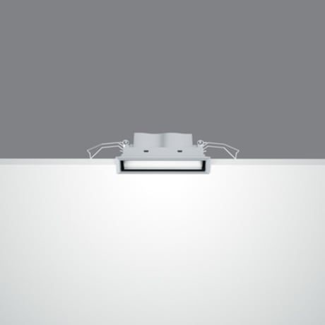 Apparecchio miniaturizzato rettangolare ad incasso con sorgenti LED. Corpo principale con superficie radiante in alluminio pressofuso, versione con cornice perimetrale di battuta. Sistema ottico asimmetrico specializzato per ottenere una efficace distribuzione wall washer. Recuperatore di flusso - riflettore in alluminio superpuro - schermo in PMMA con texture millerighe; una speciale pellicola in materiale acrilico, abbinata allo schermo, permette di ottenere un’emissione uniforme ed efficace sulla parete. Telaio perimetrale interno in policarbonato nero. Fornito con gruppo di alimentazione dimmerabile DALI collegato all’apparecchio. LED bianco warm - lifetime con flusso residuo 80% (L80): 50.000 ore - Ta 25°. LED 10W, 900lm. Efficienza luminosa (lm/W):26. Warm 3000K CRI83. Ottica: WW - Wall Washer. Orientabilità: fisso. Colore: Bianco / Nero.