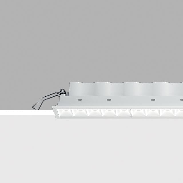 Apparecchio ad incasso rettangolare a 15 elementi ottici per sorgenti LED - ottiche fisse con riflettori Opti-Beam ad alta definizione in termoplastico metallizzato, integrati in posizione arretrata nello schermo antiabbagliamento. Corpo principale con superficie radiante in alluminio pressofuso, versione con cornice perimetrale di battuta. La finitura totale bianca e la tecnologia brevettata del sistema ottico garantiscono un elevato flusso luminoso, uniformato e ottimizzato da uno speciale filtro diffusore in grado di limitare sensibilmente l’abbagliamento diretto. Fornito con gruppo di alimentazione elettronico dimmerabile DALI collegato all’apparecchio. Potenza nominale [W]: 31. Temperatura colore [K]: 3000. Flusso nominale [Lm]: 2760