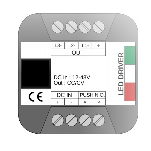 Easy RGB push è un sequenziatore RGB che permette di controllare dispositivi LED RGB in corrente costante. Il dispositivo dispone di un’uscita a 3 canali e può essere utilizzato per creare effetti RGB, con modalità di tempo impostabili da pulsante (normalmente aperto). La tensione di alimentazione è da 12 a 48Vdc. Il dispositivo permette di regolare la tonalità del colore e i tempi di rotazione colore del dispositivo LED RGB mediante un pulsante NA: Impostazione della velocità di rotazione del ciclo RGB.Selezione del tono colore desiderato. La curva di regolazione ottimizzata permette una dissolvenza morbida dei colori, garantendo il massimo comfort visivo. In base alla versione, questo dispositivo permette la creazione di effetti di bianco dinamico o di cicli RGB con diverse velocità di rotazione del tono colore, che può essere selezionato a piacere. I dispositivi vantano una serie di protezioni: sovratemperatura, sovralimentazione, sottoalimentazione, inversione della polarità di alimentazione, corto circuito in uscita, limitatore di corrente in uscita. Ingresso 12-48Vdc. uscita 3x350mA. Gruppi RGB controllabili 1-3@12Vdc / 1-6@24Vdc / 3-12@48Vdc N° LED controllabili 9@12Vdc / 18@24Vdc / 36@48Vdc.