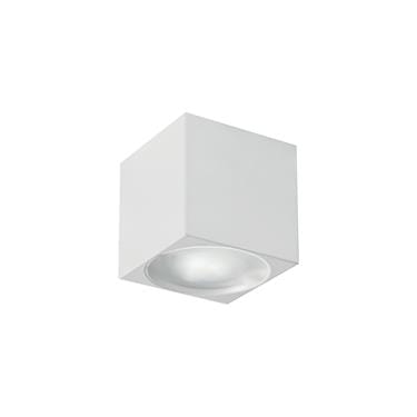 Apparecchio a plafone da interno o esterno; 6W - 350/500mA; 3 power LED; 2700K; CRI: 75÷85; ottica inclinata di 20° con schermo frontale satinato: 25°; corpo in alluminio anticorodal estruso, schermo in policarbonato mono-satinato; finitura: bianco; temperatura di esercizio: -10°C +45°C; temperatura vetro: max 40°C (Ta 25°C); grado di protezione contro i liquidi e i corpi solidi: IP54; sicurezza fotobiologica: gruppo rischio 1 secondo EN62471:2006; montaggio con viti e tasselli; classe di isolamento III;peso 0,33kg; dimensioni 55x55x55mm; collegamento in serie con 2 cavi unipolari da 30cm; dimmerazione disponibile mediante alimentatore dimmerabile.