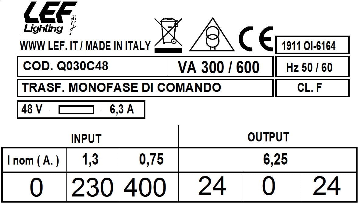 L.E.F. SRL - LEFQ030C48 T.M. 300VA 230.400V / 24.0.24V