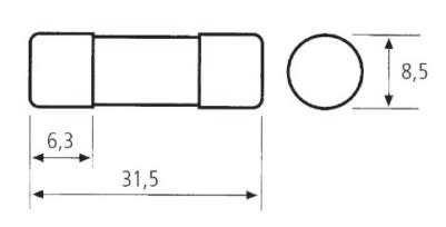 Fusibili cilindrici tipo aM; Corrente nominale: 2 A. Senza percussore 8,5 x 31,5 mm. Tensione: 400 Vac. Potere d\\'interruzione 20kA