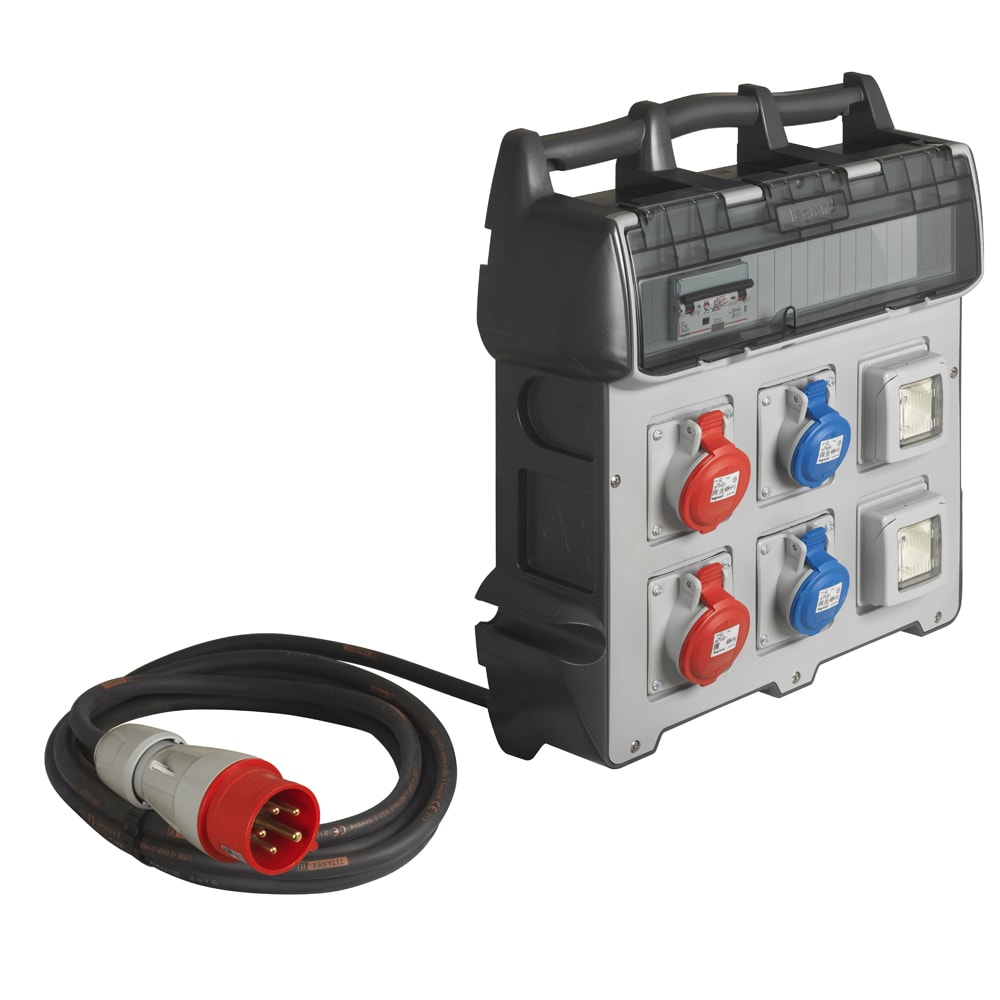 Quadro da cantiere con maniglia integrata, per l\\'alimentazione di utensili elettrici portatili. Materiale: corpo in ABS - finestre in policarbonato. Facilità di fissaggio a muro senza dover aprire il centralino (fissaggi esterni). Supporti per fissaggio cavi su entrambi i lati. Protezione integrata con interruttore magnetotermico differenziale con In= 16 A, Idn= 30mA ed Icn= 6kA. Versione Con 6 prese IP44, IK09. Composizione: 2 x 2P+T 16 A, presa standard tedesco + 2 x 2P+T 16 A, prese IEC 230Vac + 2 x3P+T 16 A, prese IEC 380/415Vac. Con 10 m di cavo e spina IEC 16A - 380/415Vac