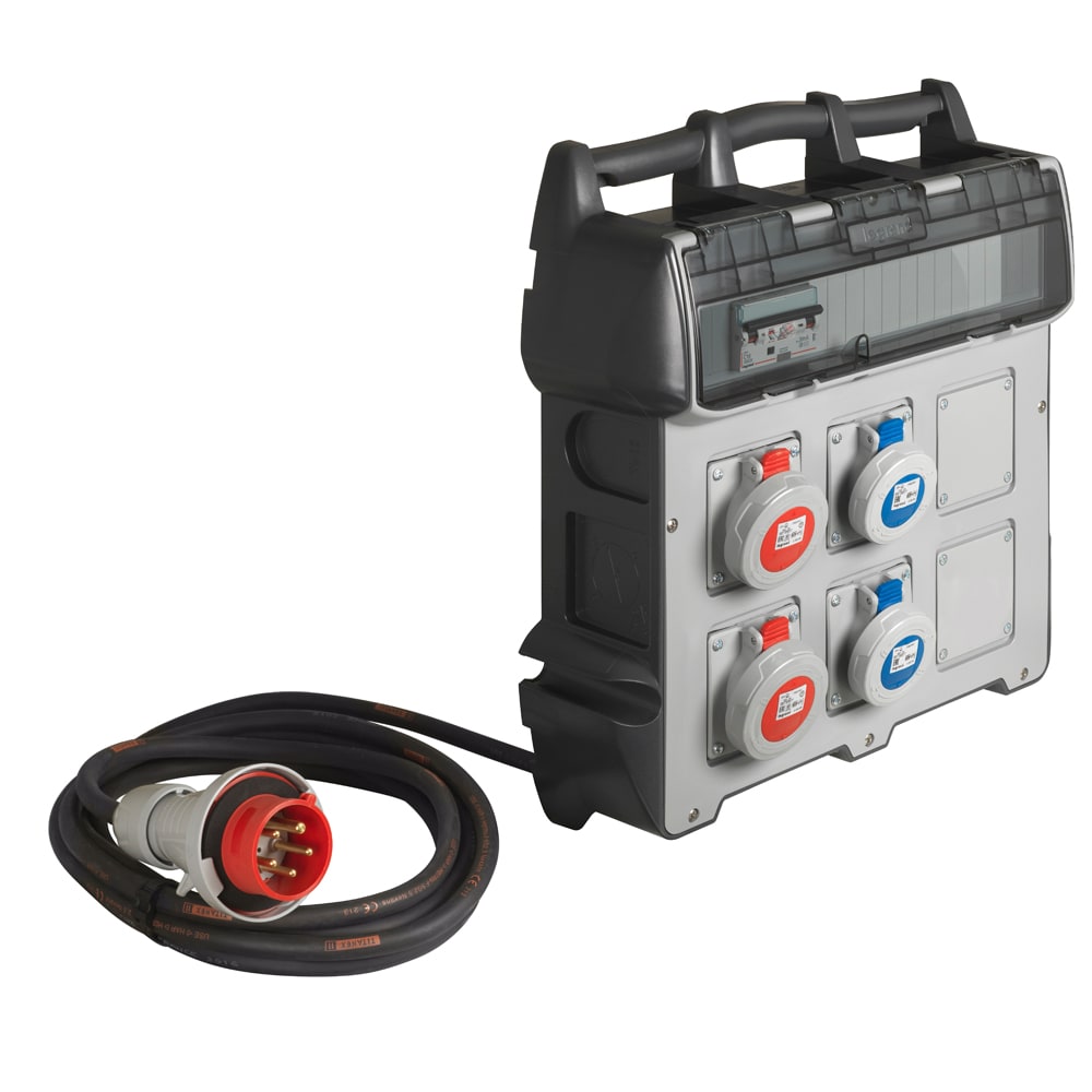 Quadro da cantiere con maniglia integrata, per l\\'alimentazione di utensili elettrici portatili. Materiale: corpo in ABS - finestre in policarbonato. Facilità di fissaggio a muro senza dover aprire il centralino (fissaggi esterni). Supporti per fissaggio cavi su entrambi i lati. Protezione integrata con interruttore magnetotermico differenziale con In= 16 A, Idn= 30mA ed Icn= 6kA. Versione con 4 prese IP55, IK09. Composizione: 2 x 2P+T 16A, prese IEC 230Vac + 2 x 3P+T 16A, prese IEC 380/415Vac. Con 10 mdi cavo e spina IEC 16A - 380/415Vac