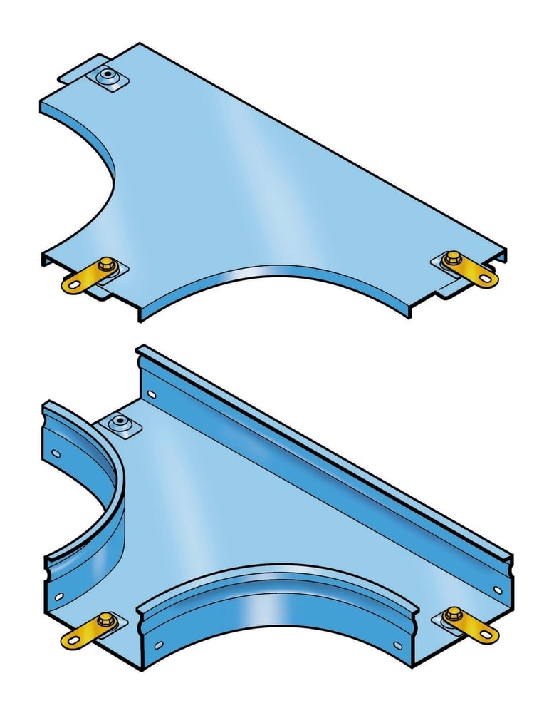 Derivazione piana a T completa di coperchio. Altezza: 75 mm. Larghezza: 200 mm. Finitura Z: Acciaio zincato sendzimir.