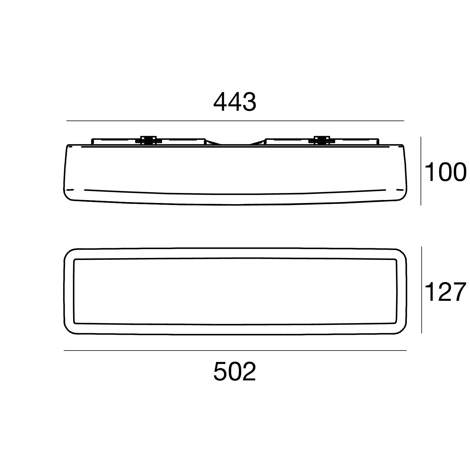 Plafone a doppia emissione per applicazione outdoor. La sorgente luminosa LED, di colore bianco caldo, con distribuzione luminosa General Lighting, è composta da 78 LED topled, con una CCT 4000 K ed un CRI 85; il flusso luminoso della sorgente è di 1641 lm, con un'efficienza nominale di 126.2 lm/W.