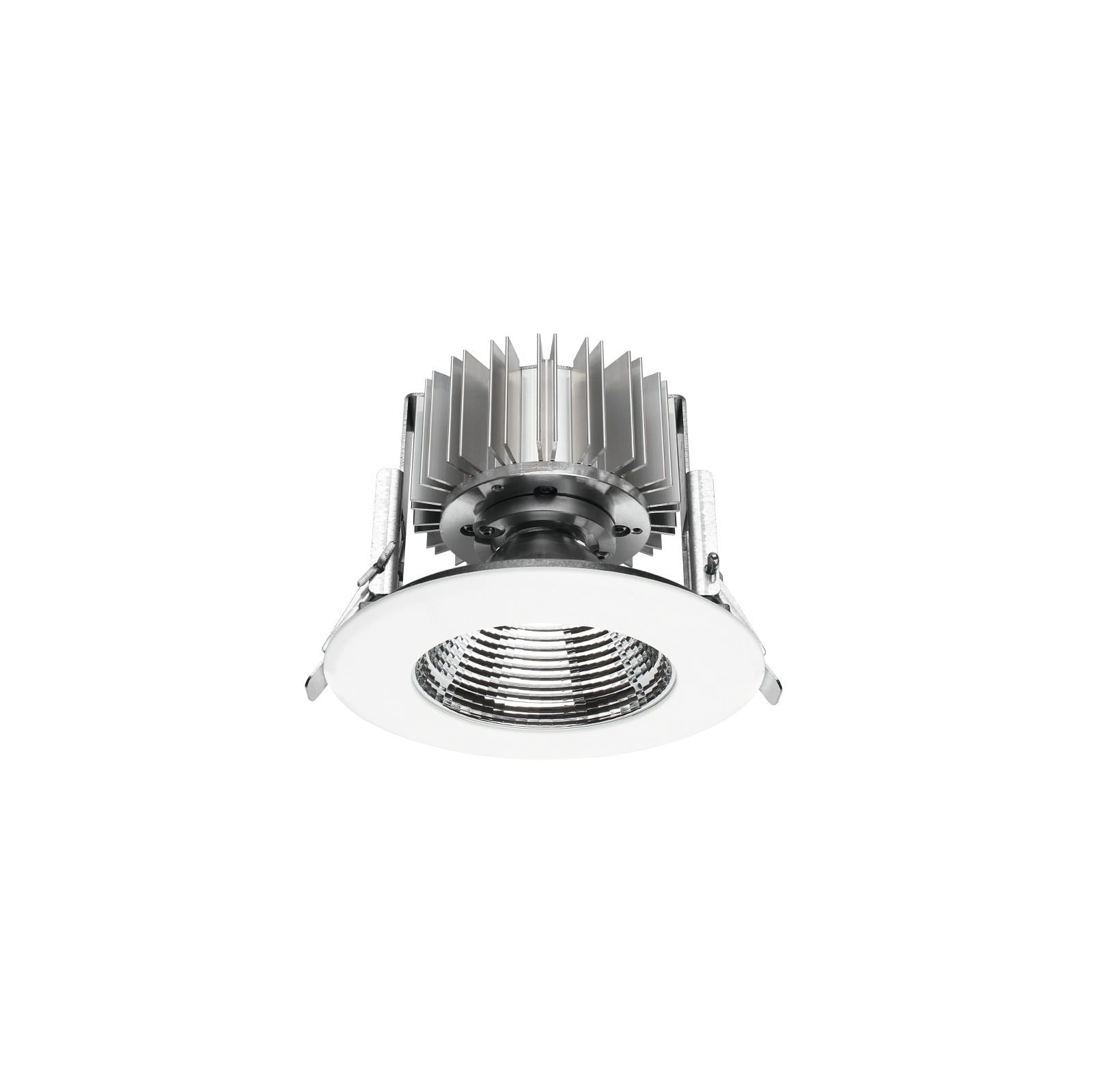 Downlights a singola emissione per applicazione indoor. La sorgente luminosa LED, di colore bianco caldo, con distribuzione luminosa 40°, è composta da 1 LED arrayled, con una CCT 3000 K ed un CRI 80; il flusso luminoso della sorgente è di 3321 lm, con un'efficienza nominale di 132.8 lm/W. Il corpo dell'apparecchio, realizzato in policarbonato, presenta una finitura di colore bianco ral 9003 goffrato, ottenuta tramite verniciatura. Il grado di protezione è IP20; il peso complessivo è di 0.9 kg. Il driverd’alimentazione non è fornito e deve essere ordinato separatamente. La potenza assorbita dall'apparecchio è di 25 W. Il cavo per l'alimentazione è incluso e presenta. L'apparecchio presenta una classe di isolamento III ed è installabile a soffitto, con foro tondo di diametro 129 mm (nel cartongesso).