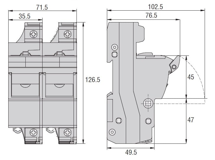 BASE PORTAFUSIBILI OMOLOGATA CURUS, PER FUSIBILI 22X58MM. CORRENTE NOMINALE 125A (690VAC), 1P+N. SENZA INDICATORE LUMINOSO. 2 MODULI