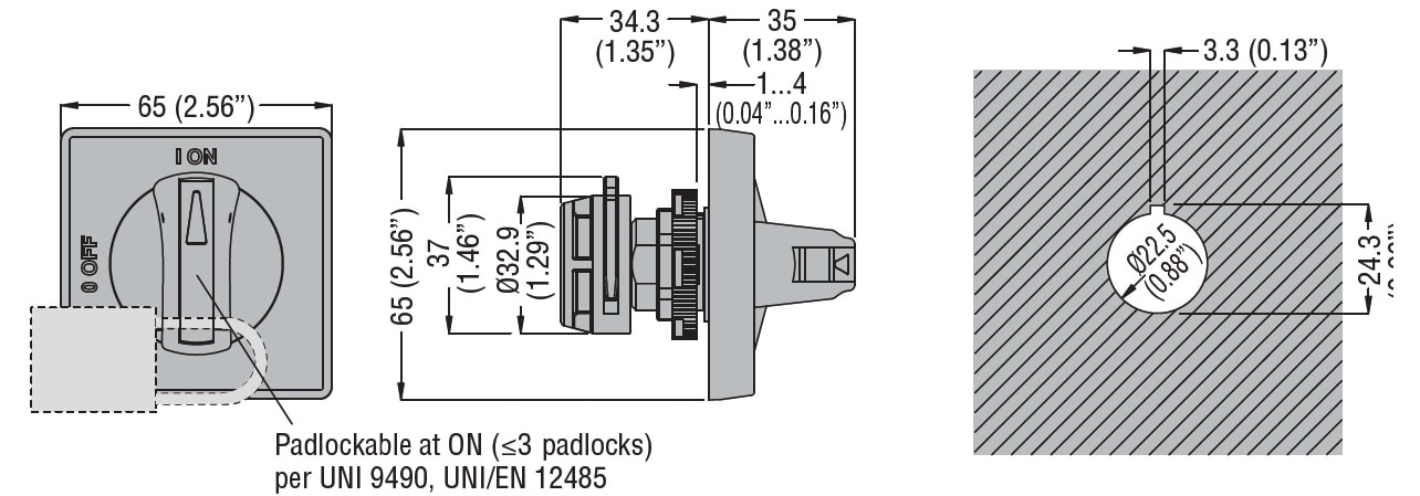 MANIGLIA BLOCCO PORTA. LUCCHETTABILE, IP65. NERA, PER GA…A, GA063SA, GA016C...GA040C E GA…D. FISSAGGIO A GHIERA. MANIGLIA CON SELETTORE SPORGENTE LUCCHETTABILE IN POS. ON (UNI 9490 E UNI EN 12845).