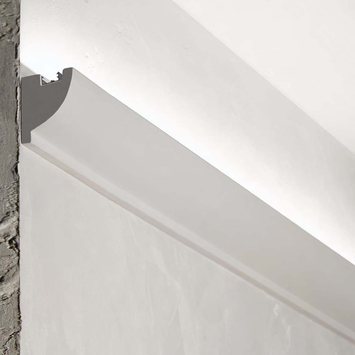Profilo prefinito in gesso, per installazione a parete, completo di barra in alluminio per applicare una striscia LED. Chiusure laterali da effettuare durante il montaggio.