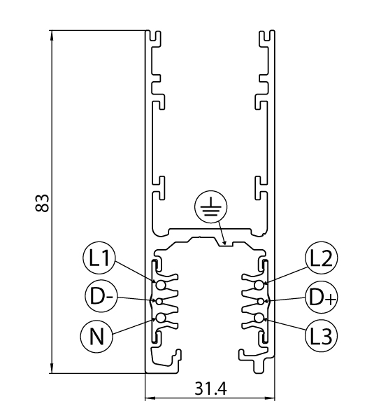 Binario elettrificato trifase (tensione di rete 230/250V - 16A) a 6 conduttori: 4 per modalità trifase, 2 per la gestione di un qualsiasi segnale (es. dali, dmx, lon, eib, ecc). Lunghezza 1m. Il sistema formato da n. 3 conduttori di fase + neutro permette di ottenere n.3 circuiti distinti per n.3 accensioni separate. Rete trifase: carico complessivo di 16A (10500VA), DALI 2X1A (100VA). Rete monofase: carico massimo di 16A (3500VA), DALI 2x1A. Possibilità di utilizzare lo spazio superiore per l'installazione di una strip LED per l'illuminazione indiretta. Accessori da ordinare separatamente. Normativa: EN 60570. Binario ad H DALI + trifase a sospensione di 3m. Colore: nero.