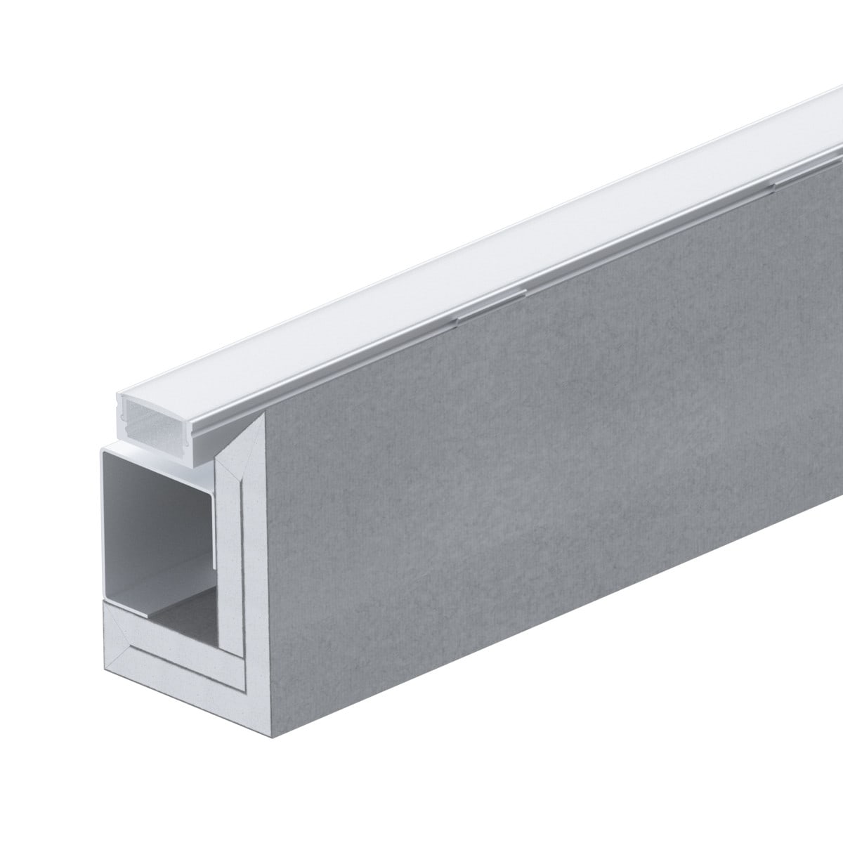 Profilo per Strip LED tagliabile in opera per installazione a parete. Corpo e testate terminali in cartongesso, profilo dissipante in lega di alluminio anodizzata naturale. Staffe per installazione a parete in lamiera di acciaio zincata e verniciata, schermo di protezione in PMMA opale. Strip LED, testate terminali ed alimentatore elettronico 24Vdc da ordinare a parte.