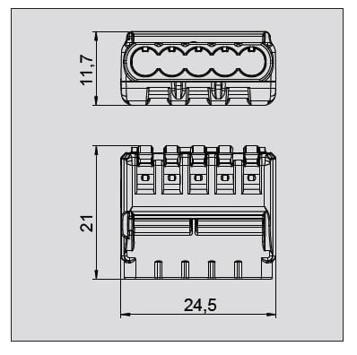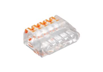 MORSETTIERA universale a 5 poli: Testato secondo EN 60998, Terminale senza viti per il collegamento di conduttori elettrici. Nell'uso di conduttori rigidi non è richiesta una apertura della leva di rilascio. Il conduttore può essere collegato direttamente al terminale. Sezione nominale: 5 x 0,2 - 2,5 mm² . Tensione nominale 450 V. Corrente nominale 24 A. Lunghezza: 9 mm (+1 mm). Apertura di prova: tester fase e pin test (. Max Ø 2 mm). Temperatura massima ambiente ammissibile secondo la norma EN 60998: 85 ° C.