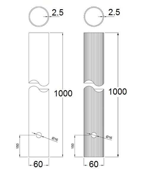 Pali per illuminazione Serie PLV/60-169. Resina poliestere rinforzata con fibra di vetro (Vetroresina) di qualsiasi colore, colori standard Grigio o Nero. La palina per illuminazione, di forma cilindrica è costituita da vetroresina e viene realizzata mediante la tecnica della poltrusione. Le caratteristiche dei materiali utilizzati, la moderna tecnologia di produzione e la sua forma, gli conferiscono infatti elevate prestazioni meccaniche, elevato isolamento elettrico, elevata resistenza alla corrosione ed un ottimo impatto ambientale. Le paline sono a marchio CE, sono disponibili di qualsiasi altezza, colore, rigate. Altezza (H)(mm): 1000. Diametro (D) (mm): 60. Interramento(mm): 320.