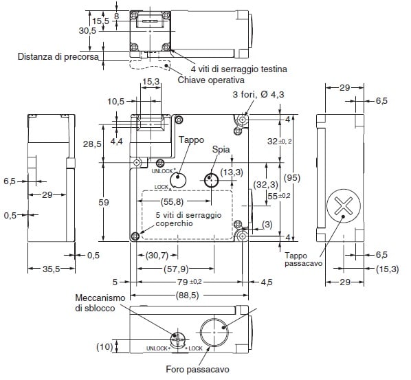 Finecorsa con blocco, passacavo PG13.5, 1NC/1NO (chiave) + 1NC/1NO (solenoide), Blocco meccanico/sblocco solenoide 24Vcc, LED
